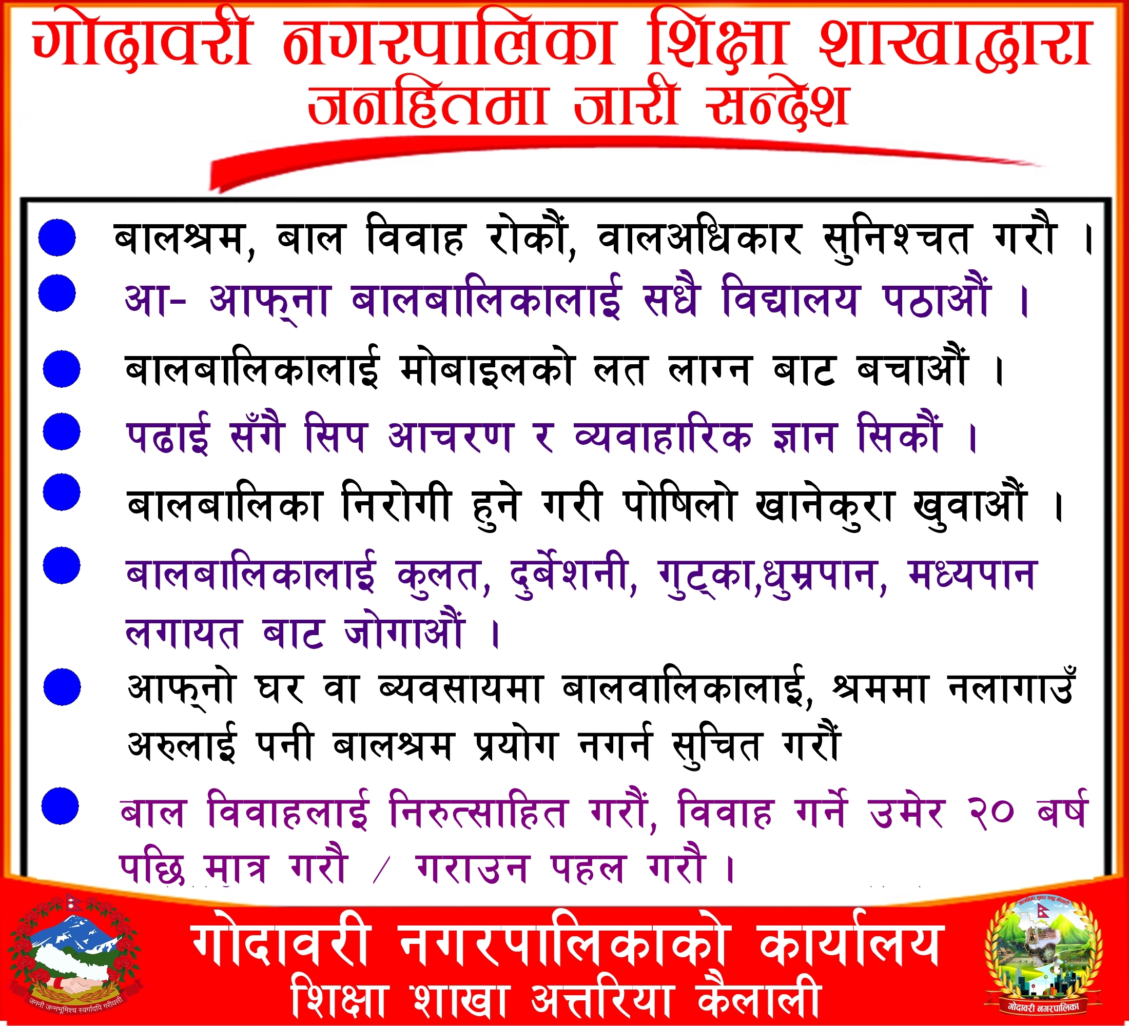 गोदावरी नगरपालिका शिक्षा शाखा प्रमुख प्रयाग राज जोशीले अनिवार्य तथा निःशुल्क शिक्षाको प्रभावकारी कार्यान्वयनका लागि विद्यालय, अभिभावक र समुदायबीच सहकार्य आवश्यक रहेको बताए। उनले शिक्षा सबै बालबालिकाको मौलिक अधिकार भएको स्मरण गराउँदै, पालिकाले यसलाई सुनिश्चित गर्न आवश्यक कार्यक्रम अगाडि बढाइरहेको बताए।