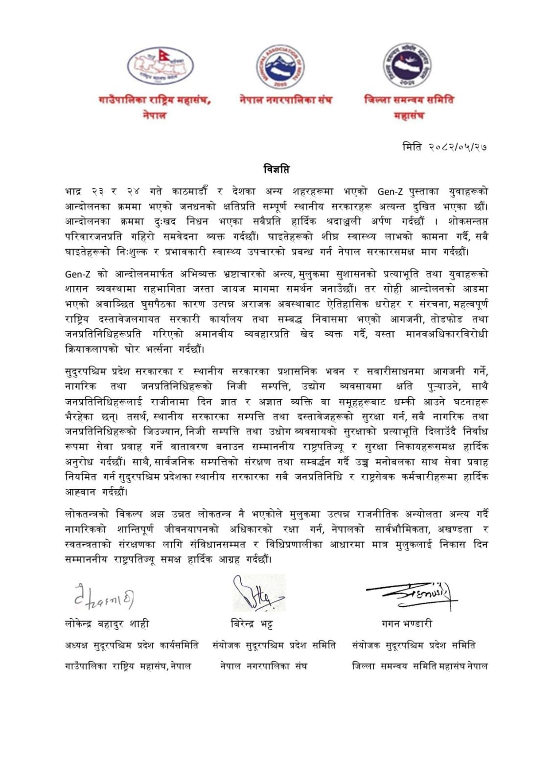 गाउँपालिका राष्ट्रिय महासङ्घ सुदूरपश्चिम अध्यक्ष लोकेन्द्र बहादुर शाही, नेपाल नगरपालिका सङ्घ संयोजक वीरेन्द्र भट्ट, र जिल्ला समन्वय समिति महासङ्घ संयोजक गगन भण्डारीद्वारा जारी संयुक्त विज्ञप्तिमा जनप्रतिनिधि, नागरिक, निजी सम्पत्ति, उद्योग व्यवसाय र सरकारी दस्तावेजहरूको सुरक्षा सुनिश्चित गर्दै निर्बाध सेवा प्रवाहको वातावरण बनाउन अनुरोध गरिएको छ।
