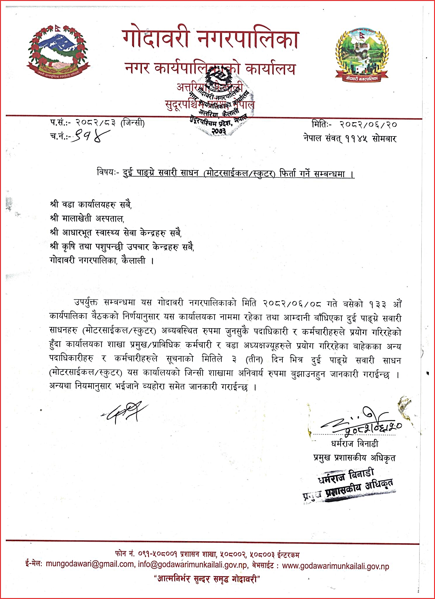 प्रमुख प्रशासकीय अधिकृत धर्मराज विनाडीद्वारा हस्ताक्षरित पत्रमा कार्यपालिका बैठकको निर्णयअनुसार शाखा प्रमुख, प्राविधिक कर्मचारी र वडा अध्यक्ष बाहेकका पदाधिकारी तथा कर्मचारीहरूले प्रयोग गरिरहेका मोटरसाइकल र स्कुटर तत्काल फिर्ता गर्न भनिएको छ।