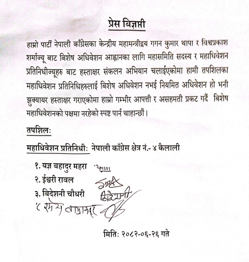 विज्ञप्तिमा प्रतिनिधिहरूले भनेका छन् कि पार्टीका केन्द्रीय महामन्त्री गगन कुमार थापा र विश्वप्रकाश शर्माद्वारा बिशेष महाधिवेशन आह्वान गर्न हस्ताक्षर संकलन अभियान चलाईएकोमा, प्रतिनिधिहरूलाई “बिशेष होइन, नियमित महाधिवेशन” भनेर झुक्याएर हस्ताक्षर गराइएको छ। यसप्रति उनीहरूले गम्भीर आपत्ती र असहमति प्रकट गरेका छन्।
