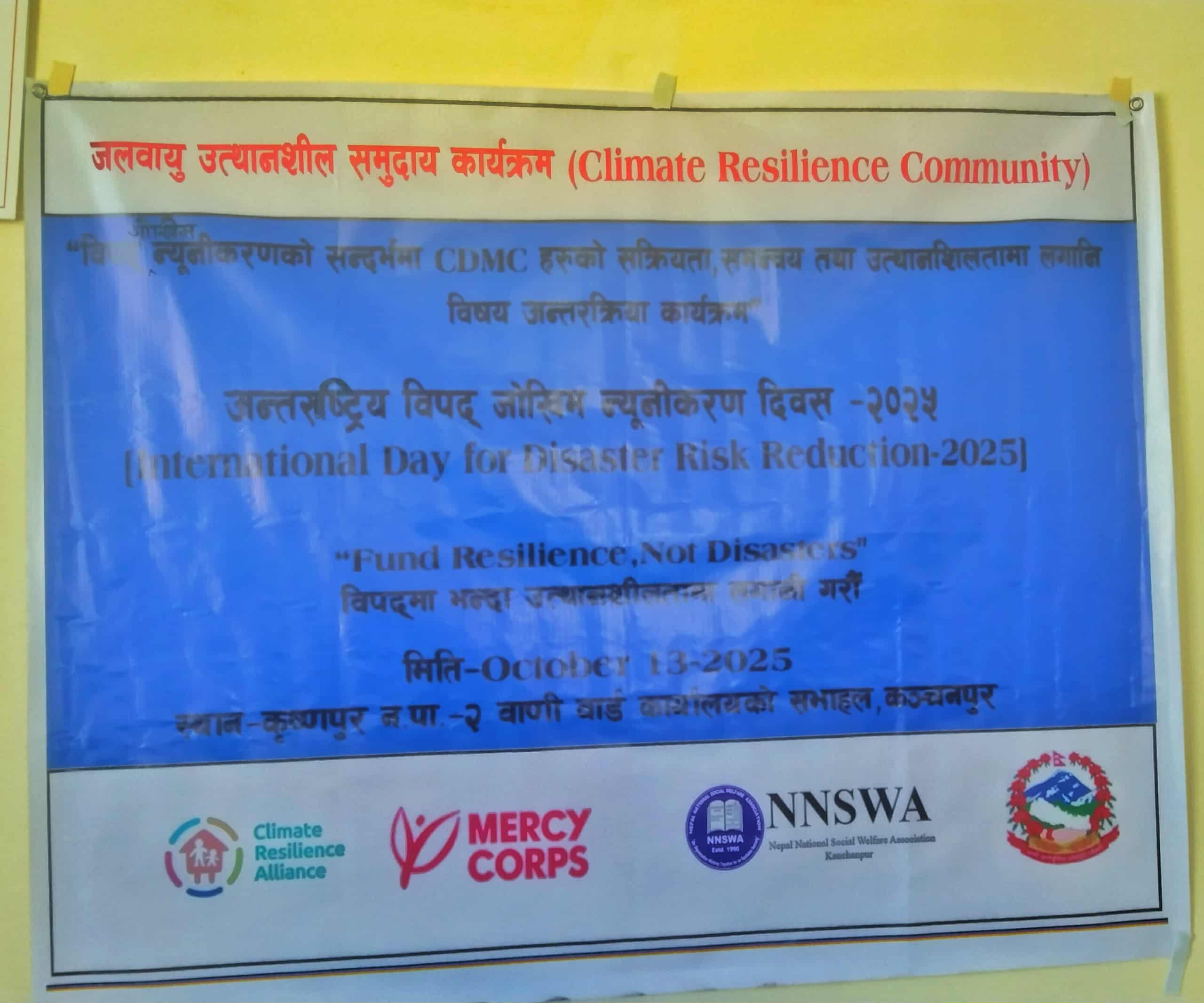 कञ्चनपुर: कञ्चनपुरको कृष्णपुर नगरपालिका–२ मा विपद् होइन, उत्थानशिलता निर्माणमा लगानी गरौ भन्ने मुल नाराका साथ अन्तर्राष्ट्रिय विपद् जोखिम न्यूनीकरण दिवस–२०८२ का अवसरमा विपद् जोखिम न्यूनीकरणको सन्दर्भमा सामुदायिक विपद् व्यवस्थापन समितिहरू (CDMC) को सक्रियता, समन्वय तथा उत्थानशीलताको लागि समुदायको आवश्यकता र चुनौती” विषयक अन्तरक्रिया कार्यक्रम सोमबार सम्पन्न भएको छ।