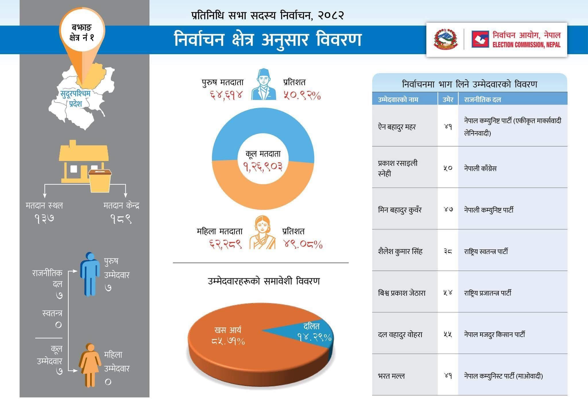 जिल्लामा कुल १ लाख २६ हजार ९ सय ३ मतदाता रहेका छन्। तीमध्ये ६२ हजार २ सय ८९ पुरुष र ६४ हजार ६ सय १४ महिला मतदाता रहेका छन्। निर्वाचनका लागि १८९ मतदान केन्द्र र १३७ मतदानस्थल तोकिएका छन्। तीमध्ये तीन मतदानस्थल सामान्य, ४९ संवेदनशील र ८५ अति संवेदनशील श्रेणीमा राखिएको प्रमुख जिल्ला अधिकारी मुकेश कुमार केशरीले बताउनुभयो ।