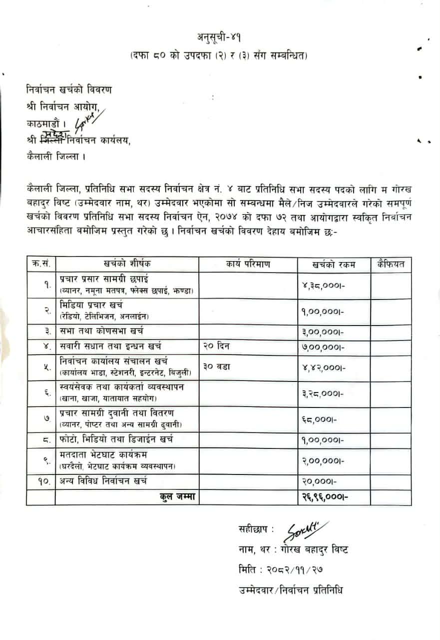 अत्तरियाः नेपाली कांग्रेसका तर्फबाट कैलाली निर्वाचन क्षेत्र नम्बर ४ का प्रतिनिधि सभा सदस्यका उम्मेदवार गोरखबहादुर बिष्ट ‘आनन्द’ ले निर्वाचन खर्च विवरण सार्वजनिक गरेका छन्।