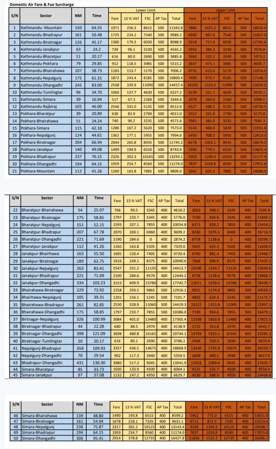 भाडामा इन्धन शुल्कसँगै वायुसेवा कम्पनीको आधारभूत भाडा, १३ प्रतिशत मूल्य अभिवृद्धि कर (भ्याट) तथा विमानस्थल शुल्क पनि जोडिन्छ।