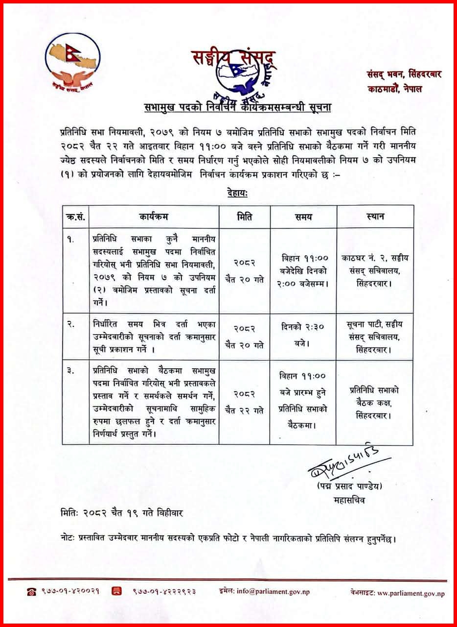 चैत २२ गते हुने प्रतिनिधिसभा सभामुख पदको निर्वाचनको तालिका सार्वजनिक गरिएको छ। संघीय संसद सचिवालयले बिहीबार निर्वाचन तालिका प्रकाशित गरेको हो।